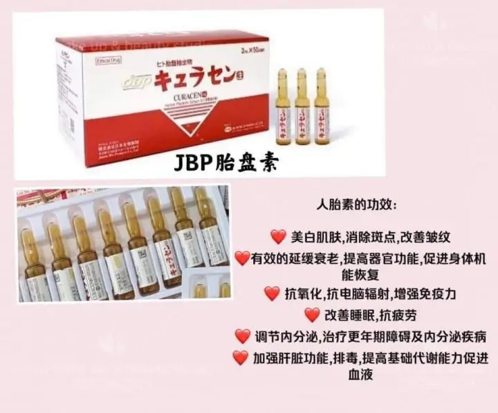 – **JBP贵妇胎盘素**结合了美思满及莱乃康胎盘素,含胎盘成分浓度更高,分子更小,吸收更快。是一款低分子高浓度的胎盘素,注射3-4支即可看到明显的皮肤变化。